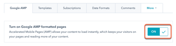 Otra estrategia que te permite utilizar HubSpot en tu blog es la activación del botón AMP. Se trata de usar un formato de página específico para dispositivos móviles con el que la página de nuestro blog carga instantáneamente.